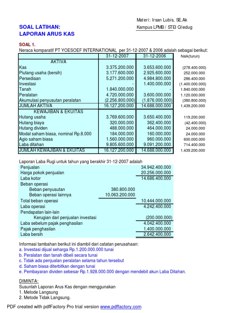 Contoh soal dan jawaban laporan arus kas pdf. Kumpulan soal pelajaran 8 contoh soal laporan arus kas. Begitulah yang dapat admin bagikan terkait contoh soal laporan arus kas metode tidak langsung dan jawabannya. Laporan arus kas disusun dari laporan keuangan ( laporan posisi keuangan/neraca atau laporan laba rugi ) b. Hal ini dikarenakan mengerjakan laporan arus kas tidak langsung tidak serumit metode langsung.