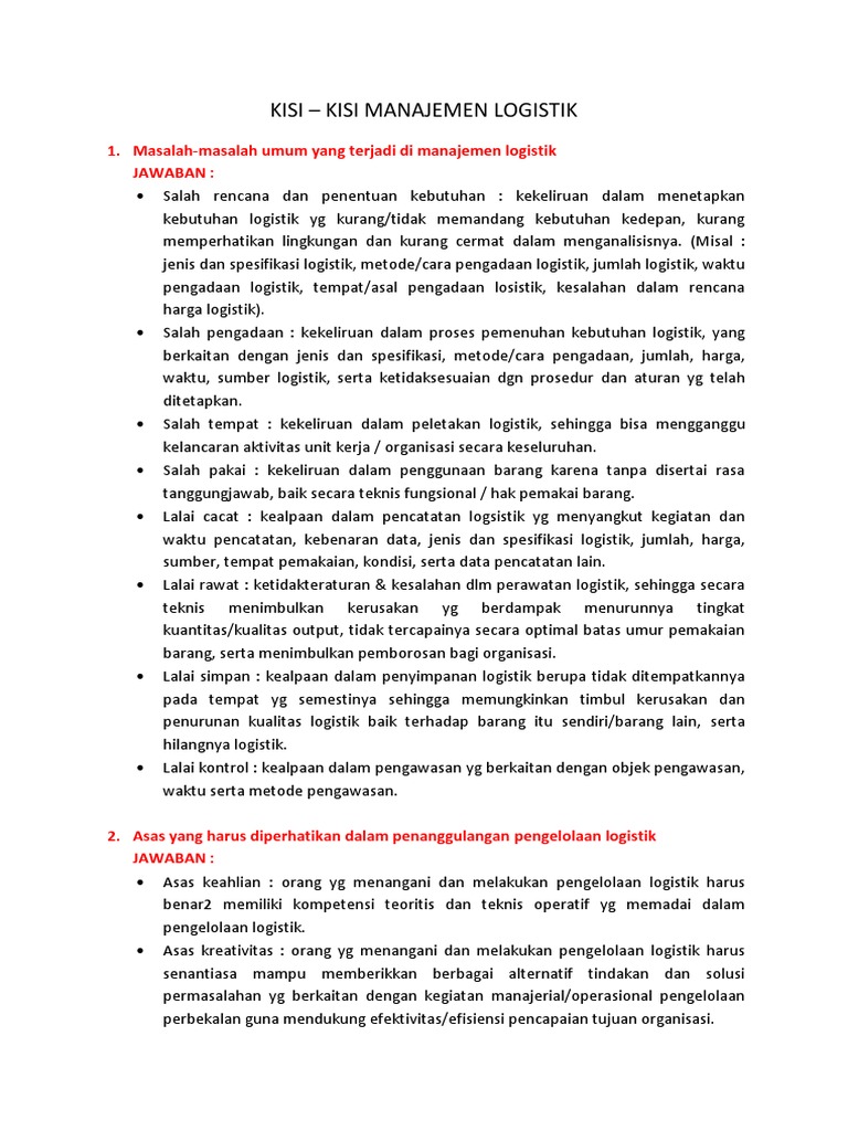 Jun 04, 2020 · soal ujian ut ilmu pemerintahan adpu4534 manajemen logistik organisasi publik beserta kunci jawaban publik organisasi pemerintah. Dec 20, 2016 · tugas membuat soal manajemen logistik slideshare uses cookies to improve functionality and performance, and to provide you with relevant advertising. Dan logistik merupakan proses perencanaan dari transportasi tersebut, termasuk dalam perencanaan, pelaksanaan, pengawasan dan yang lainnya. Transportasi bisa dikatan sebagai proses perpindahan, mau itu perpindahan yang dilakukan orang ataupun perpindahan yang dilakukan pada barang. Contoh soal pilihan ganda dan jawaban manajemen keuangan manajemen strategik manajemen kesehatan manajemen waktu.